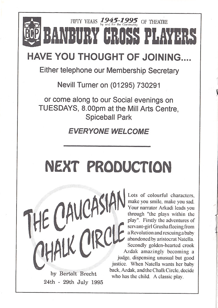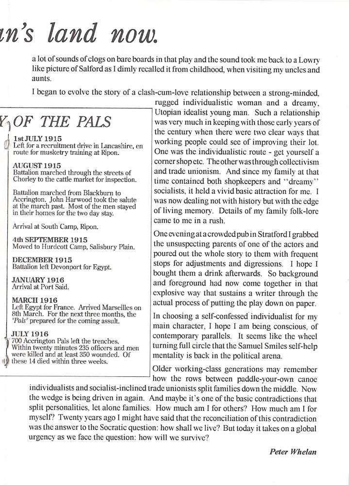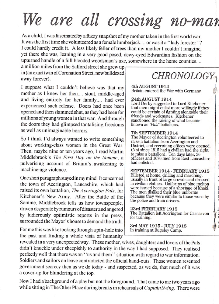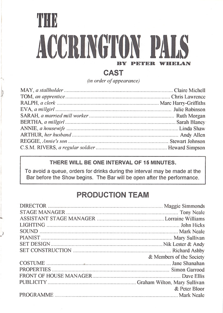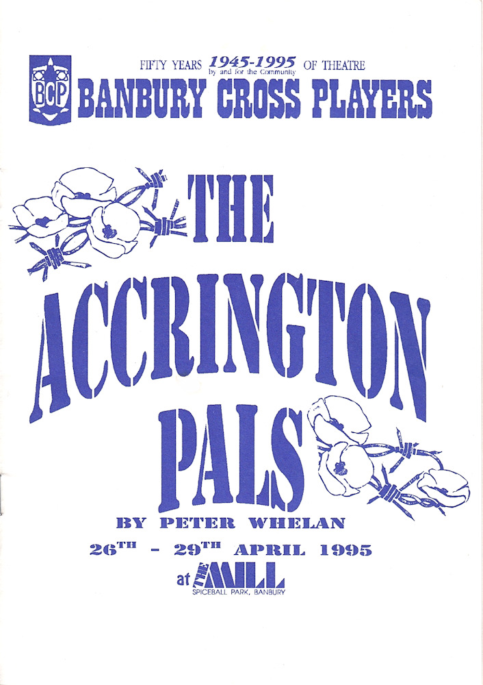 The Accrington Pals by Peter Whelan was performed by Banbury Cross Players at The Mill Arts Centre in April 1995. The Accrington Pals was directed by Maggie Simmonds and the cast was as follows:-